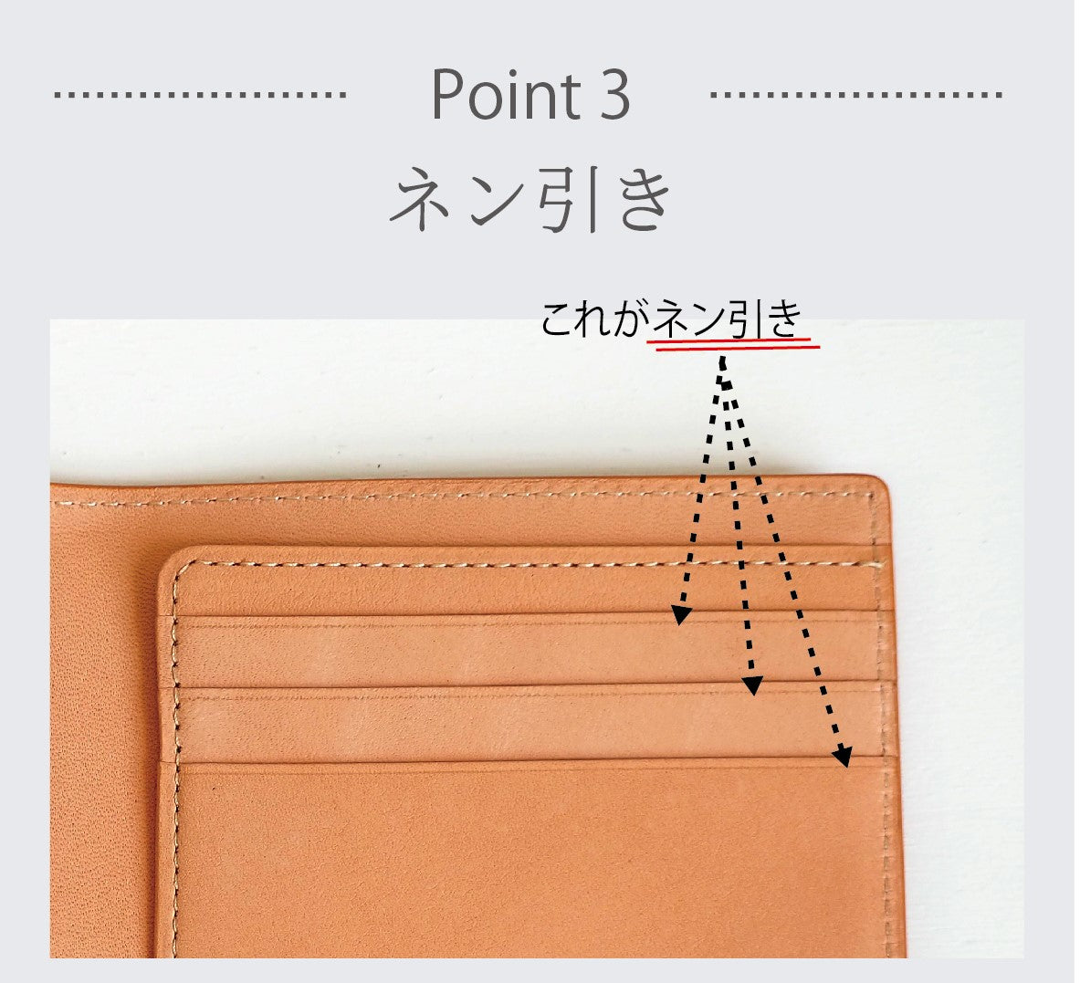 ネン引きとは革の端をへり返した部分にコテで熱を加えて引く線のこと。ネン引きを入れると商品が引き締まりグッと高級感が増します。