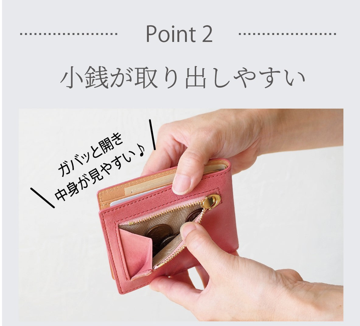小銭入れはマチが大きく開き、中が見えやすく取り出しやすい設計です。