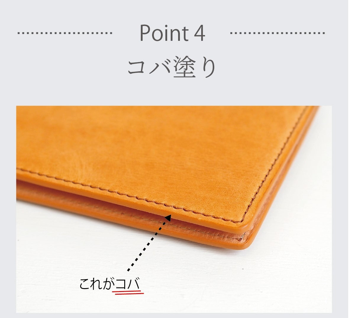 表のパーツは革の断面(コバ)を磨いてニスを塗る のを何度も繰り返し、美しい断面を作り出します。