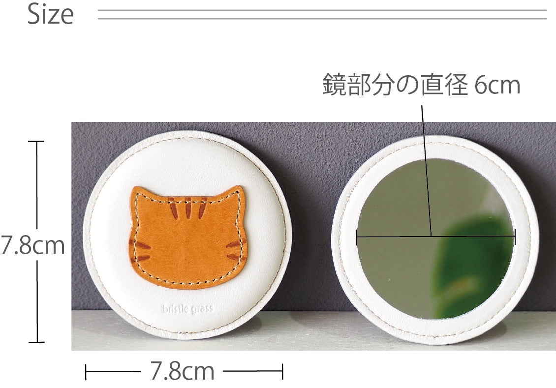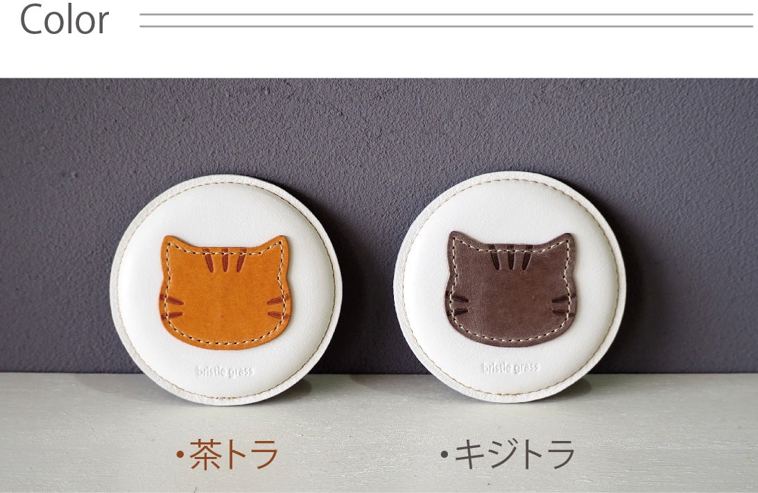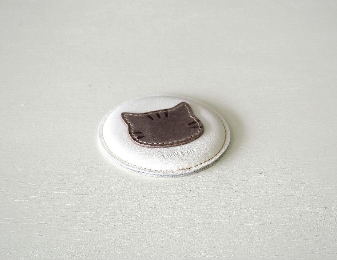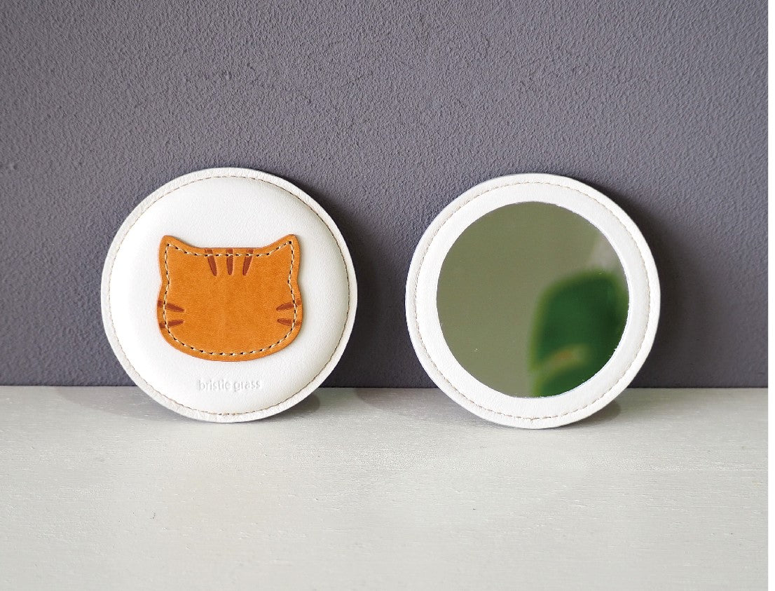 本革を使用して作られたトラ柄ねこモチーフの付いたコンパクトミラー。