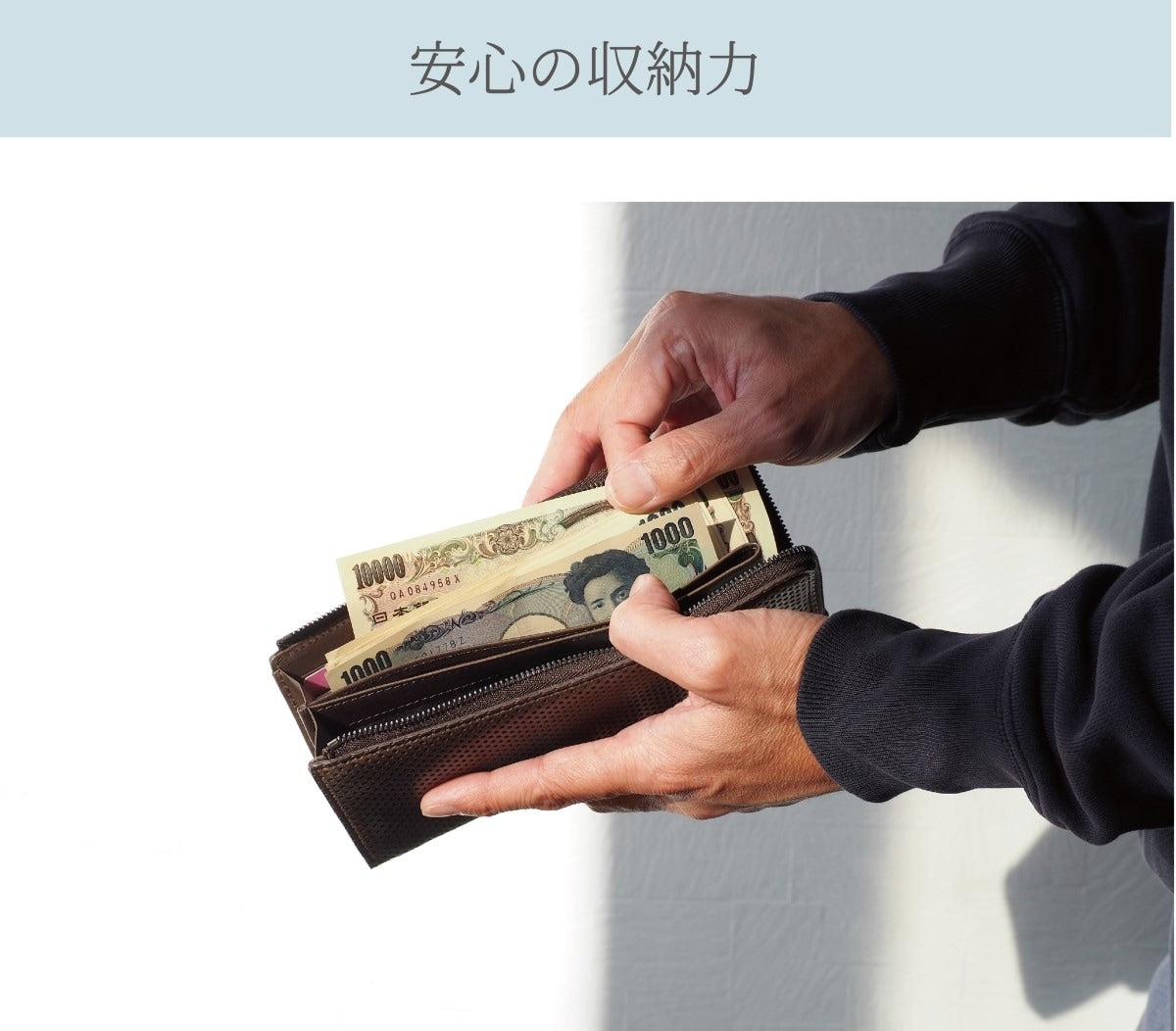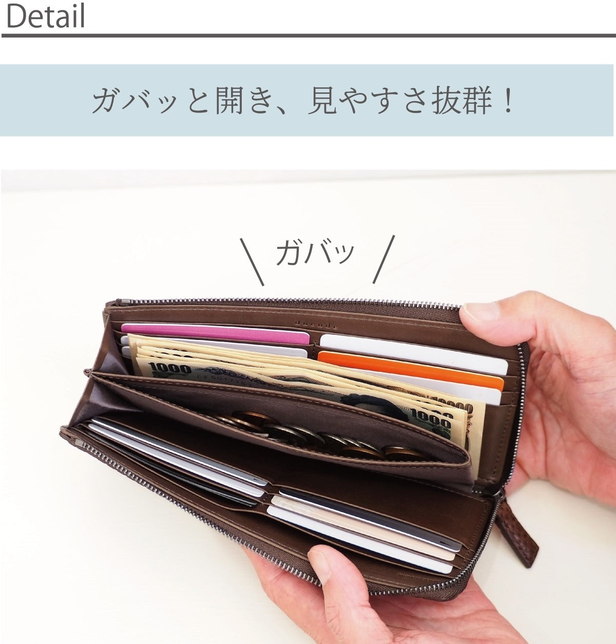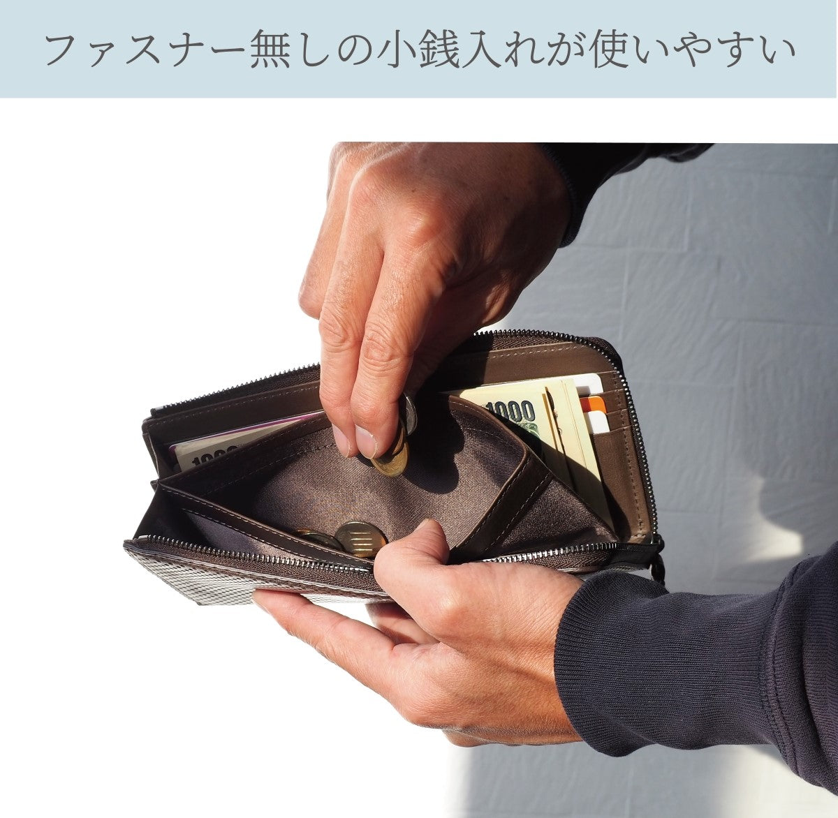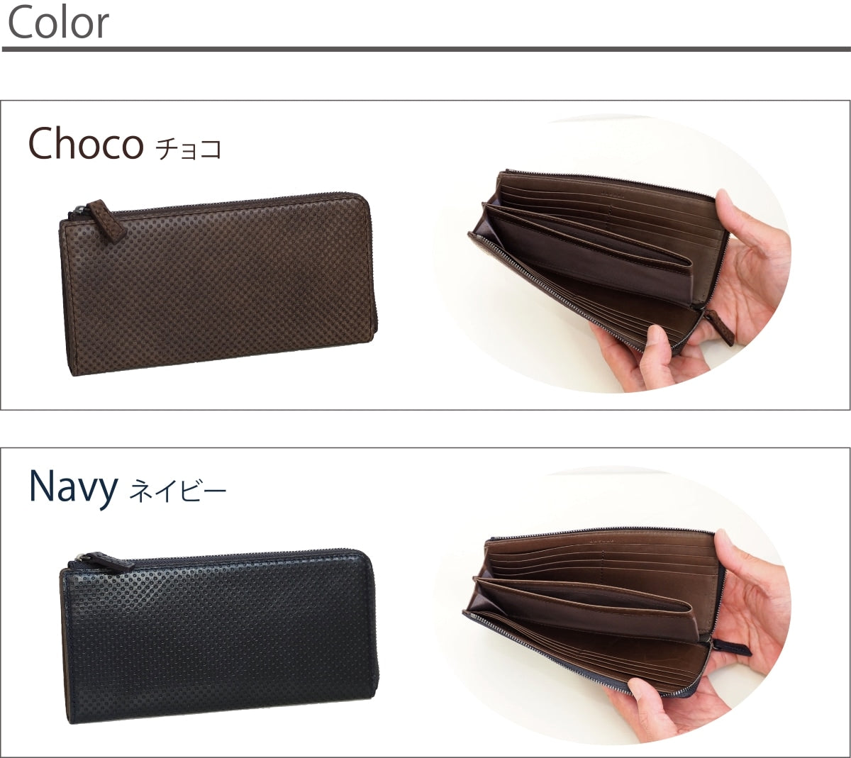 L字ファスナー長財布は、縦の高さを少し抑えているため 片手で持ちやすく、使いやすい。