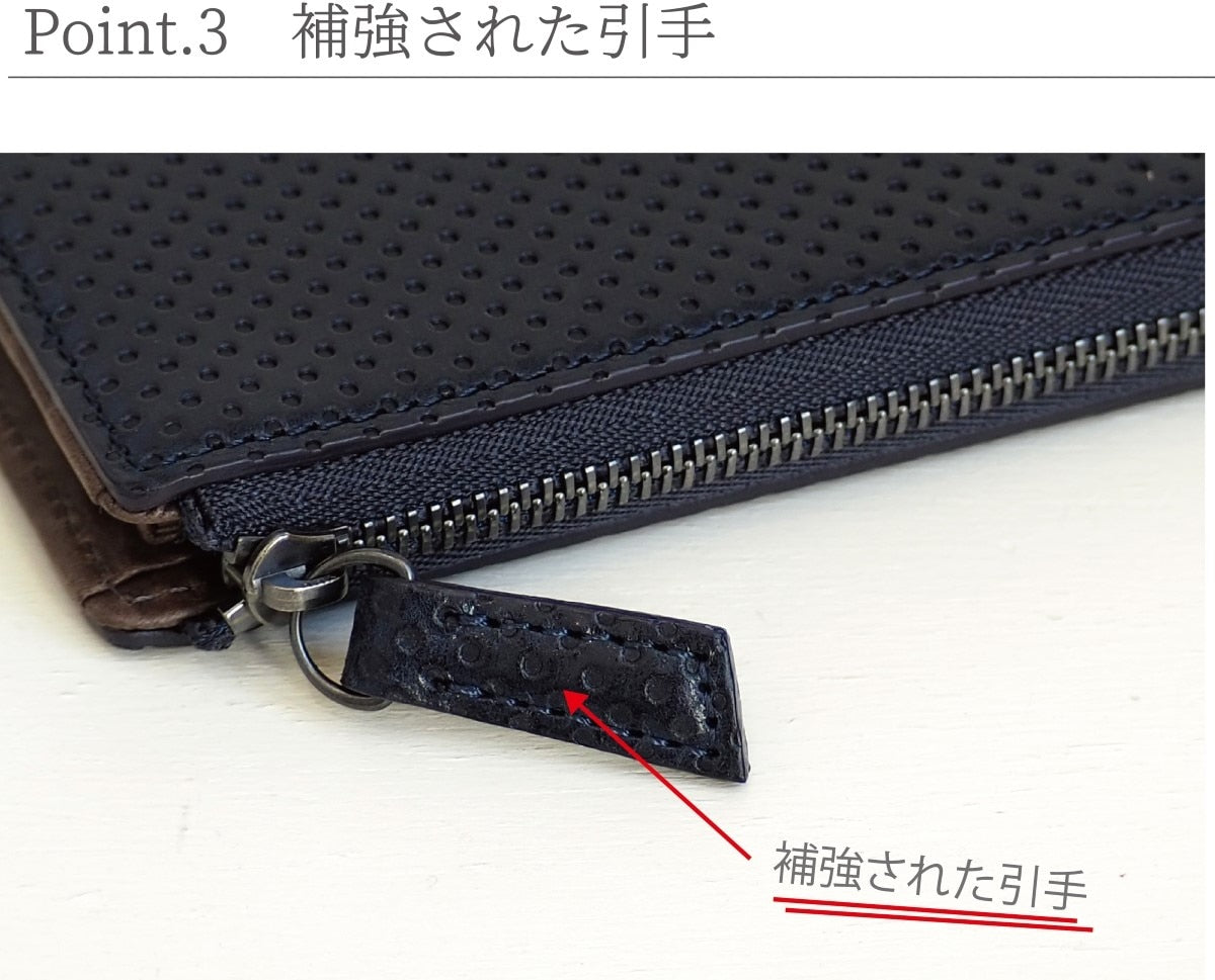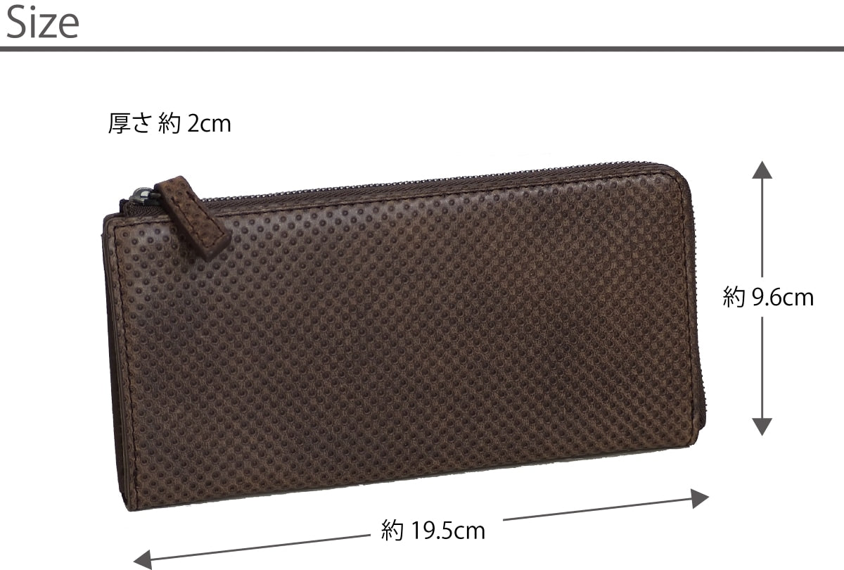 イタリア・トスカーナ地方のタンナー「テンペスティ社」の伝統的な鞣し製法で作られた革にパンチングの逆型押しを施した革で作られたL字ファスナー長財布。