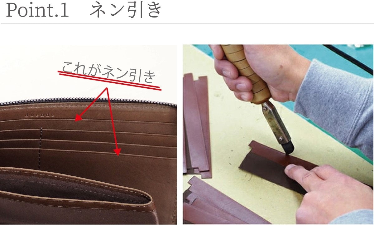 ネン引きとは革の端をへり返した部分に コテで熱を加えて引く線のこと。