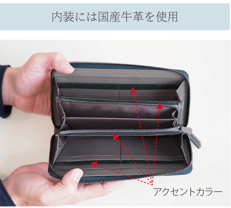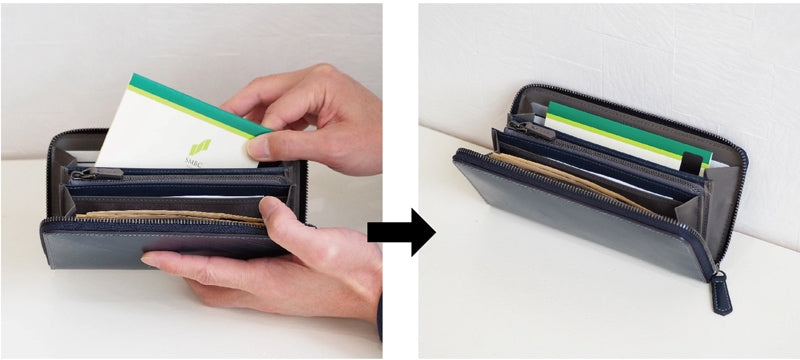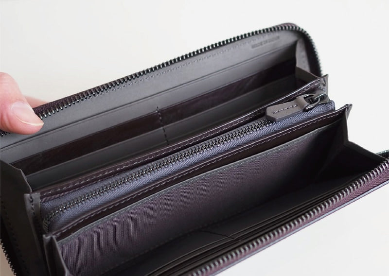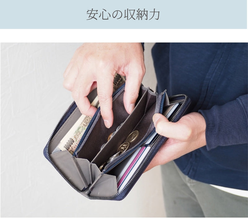 小銭入れをL字ファスナーにすることで大きく開き、 中身が取り出しやすくなります。