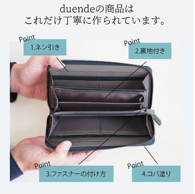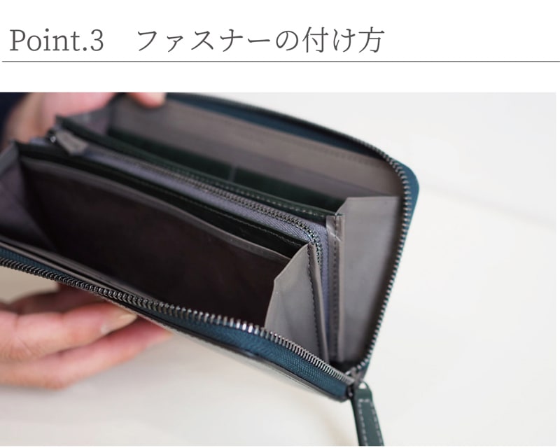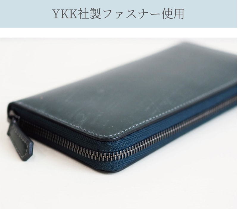 メインファスナーと中の小銭入れのファスナーには YKK社製のファスナーを使用しています。