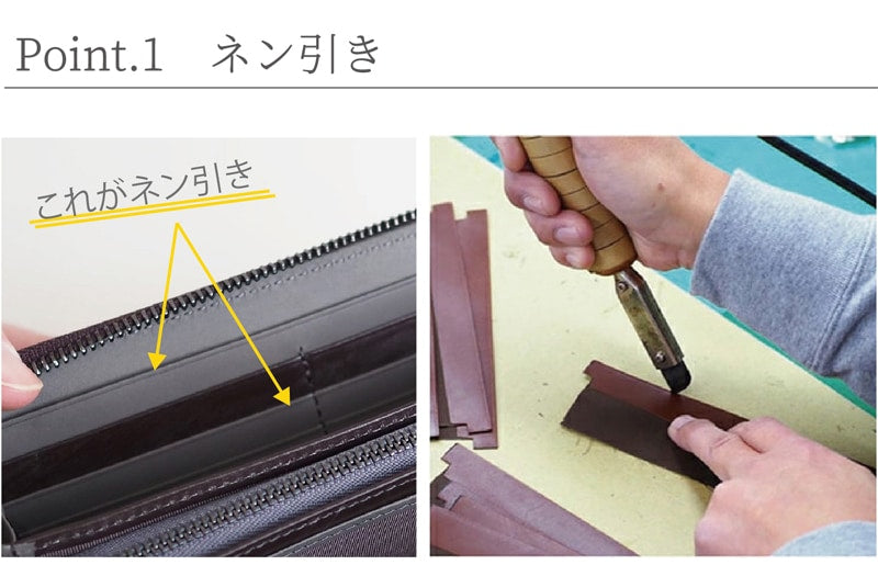 ネン引きとは革の端をへり返した部分に コテで熱を加えて引く線のこと。