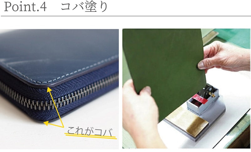 表のパーツは革の断面(コバ)を磨いて ニスを塗るのを何度も繰り返し、 美しい断面を作り出します。