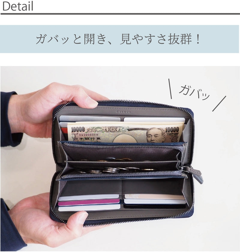 ラウンド長財布は、縦の高さを少し抑えているため 片手で持ちやすく、使いやすい。