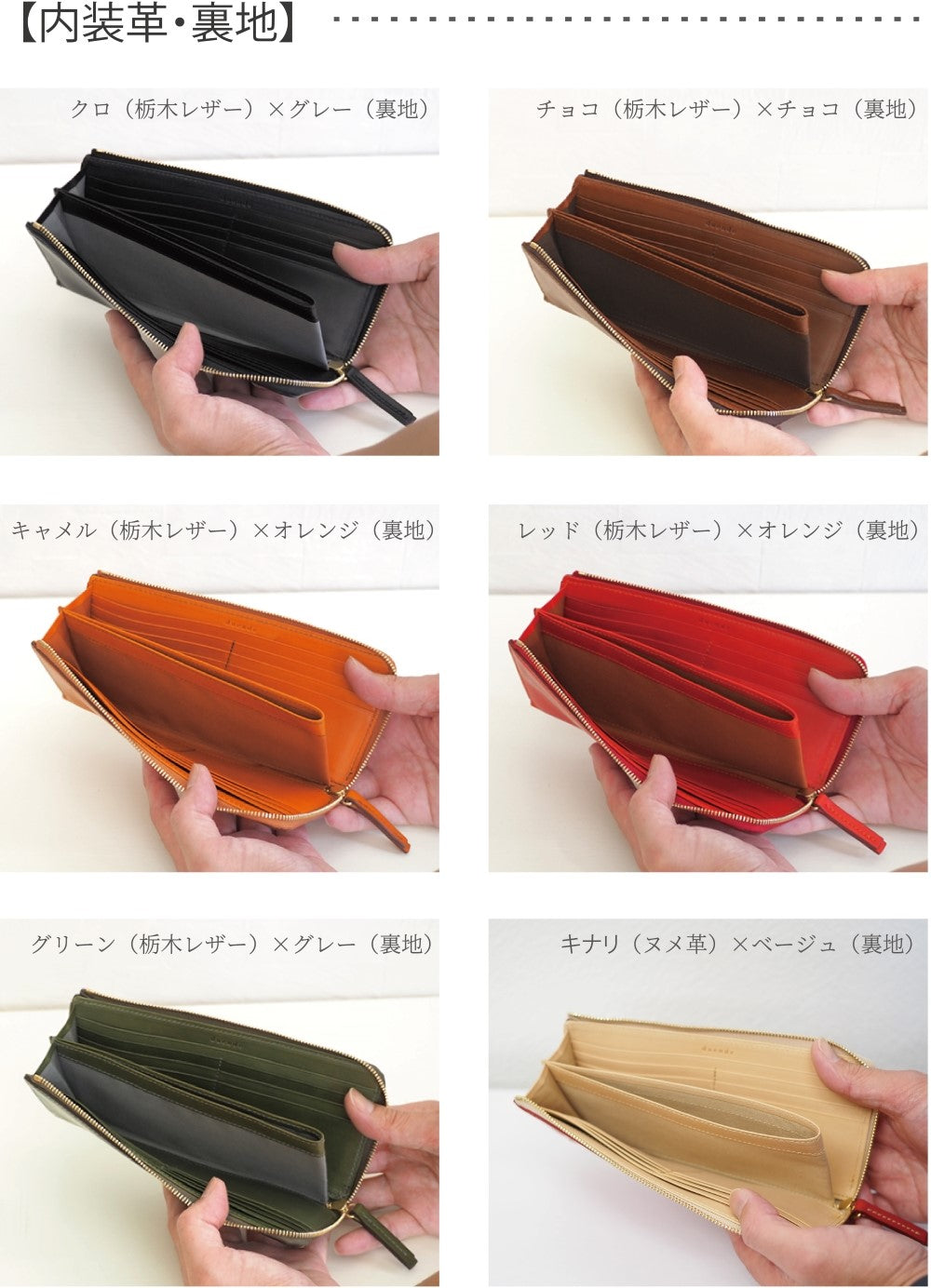 財布の内装には、表革と同じ5色の栃木レザーと、ナチュラルな色合いの国産ヌメ革の計6種類の中からお選びいただけます。