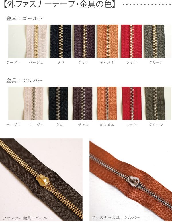 外ファスナーテープのカラーは6色、外ファスナー金具の色は2色からそれぞれお選びいただけます。