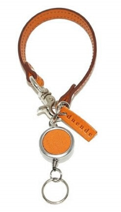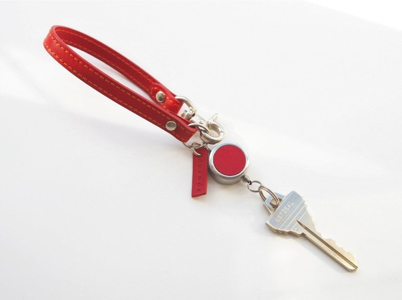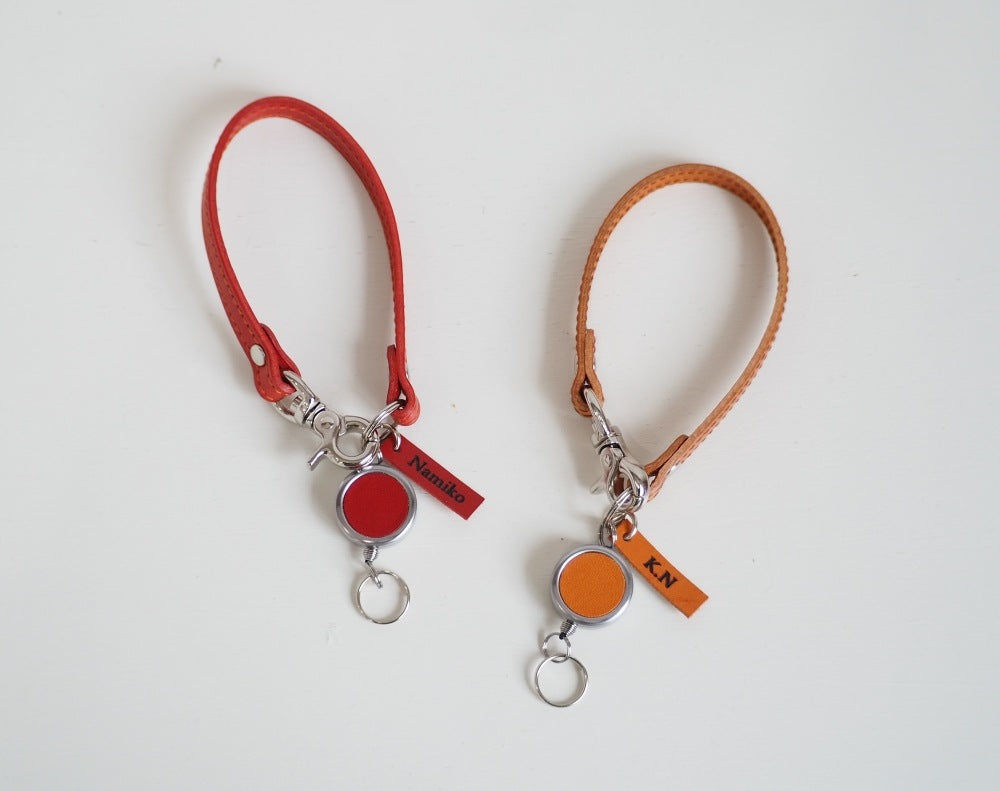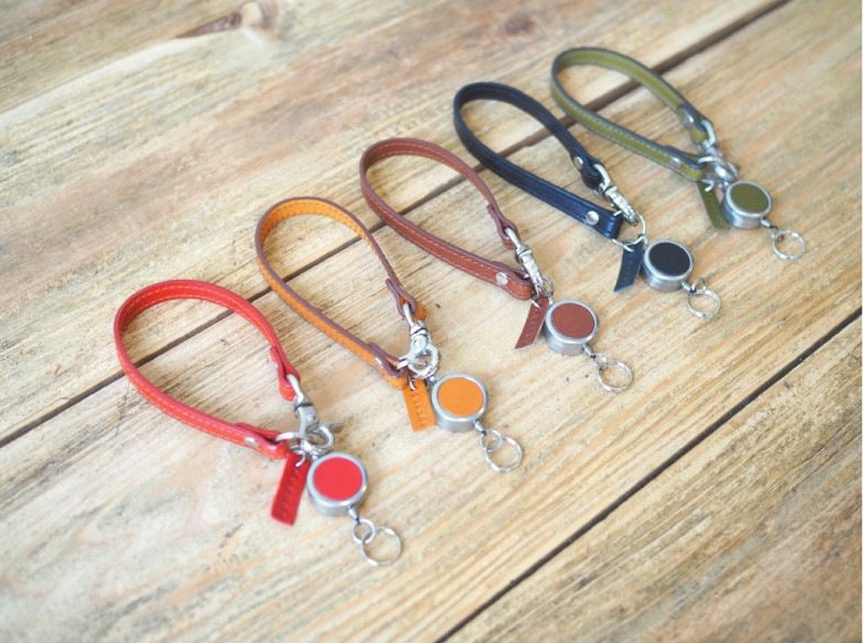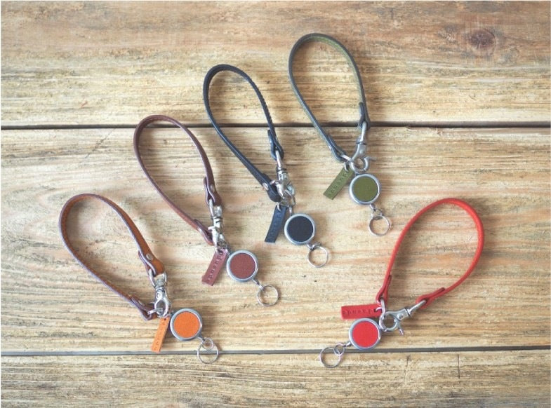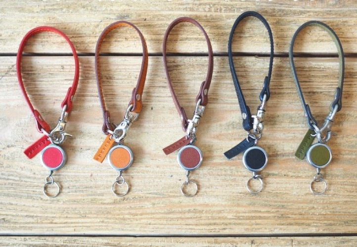 上質な栃木レザーを使用したストラップ付きリールキーホルダー。