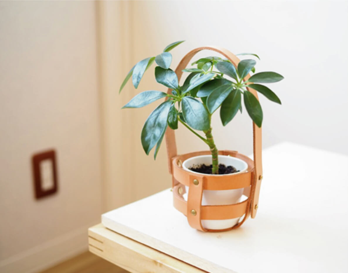 ヌメ革の経年変化を植物と共に観察するのも楽しみのひとつ。