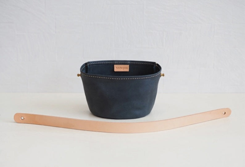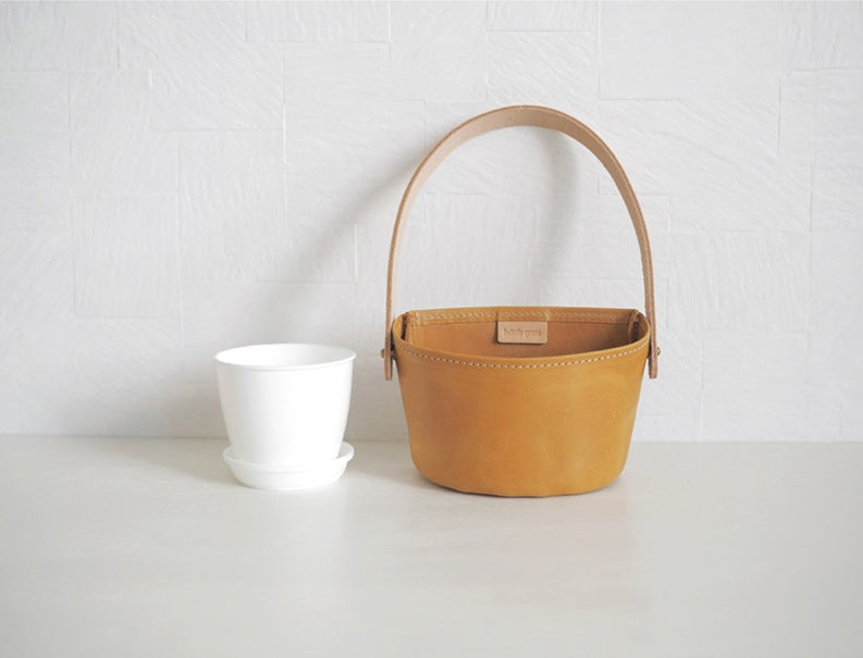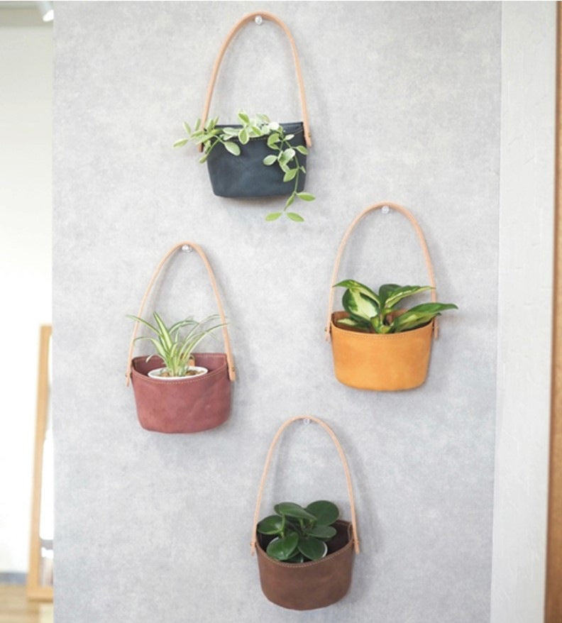 壁面に少し飾りが欲しい時や、空いた空間にちょこっと飾るのに可愛いレザープランターカバーです。